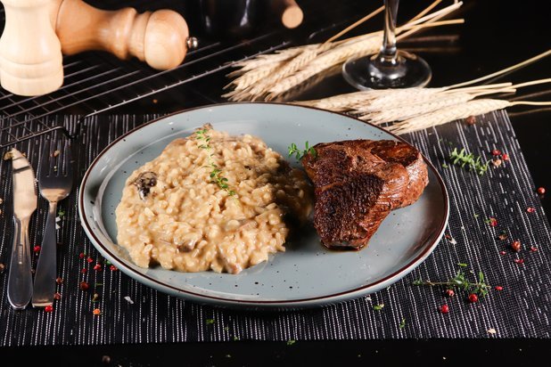 • Prato principal: risoto de funghi e cogumelos frescos com bombom de alcatra e demi glace.