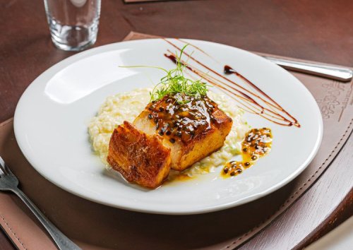 - Robalo grelhado com risoto de alho-poró e molho de maracujá.