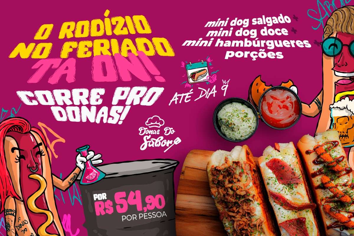 Assessoria – Em celebração ao Dia do Hot Dog, a dogueria Donas do Sabor, localizada no Sítio Cercado, promove um rodízio especial nos dias 7, 8 e 9 de setembro. Por R$54,90 por pessoa, os clientes poderão experimentar mini dogs salgados, mini dogs doces, mini hambúrgueres e diversas porções.