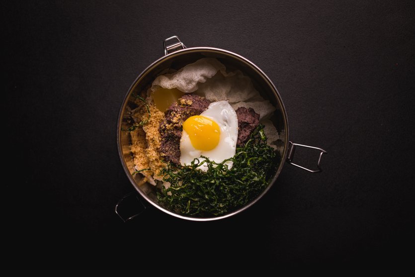 • Feijoada Molecular: que consiste em arroz desidratado, patê de feijoada, crocante de couve, torresmo em pó, ovo frito e cachaça de laranja sólida