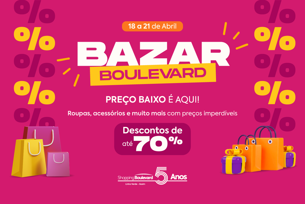 Assessoria – O Shopping Boulevard, localizado na Linha Verde, em Curitiba, realiza entre os dias 18 e 21 de abril o Bazar Boulevard”. A ação promocional foi planejada para oferecer aos consumidores a oportunidade de adquirir produtos de diversos segmentos com condições diferenciadas, apresentando descontos que chegam a até 70% em itens selecionados.